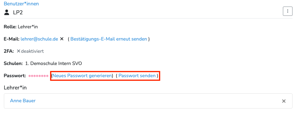 Haben Personen an Ihrer Schule das Passwort vergessen, haben Sie als Admin die Möglichkeit das Passwort zurückzusetzen. Wählen Sie zunächst wie oben beschrieben das entsprechende Benutzerkonto aus. Neben weiteren Optionen haben Sie hier die Möglichkeit das Passwort zurückzusetzen oder ein neues Passwort per E-Mail direkt an die Person zu versenden (insofern eine E-Mail Adresse hinterlegt ist):