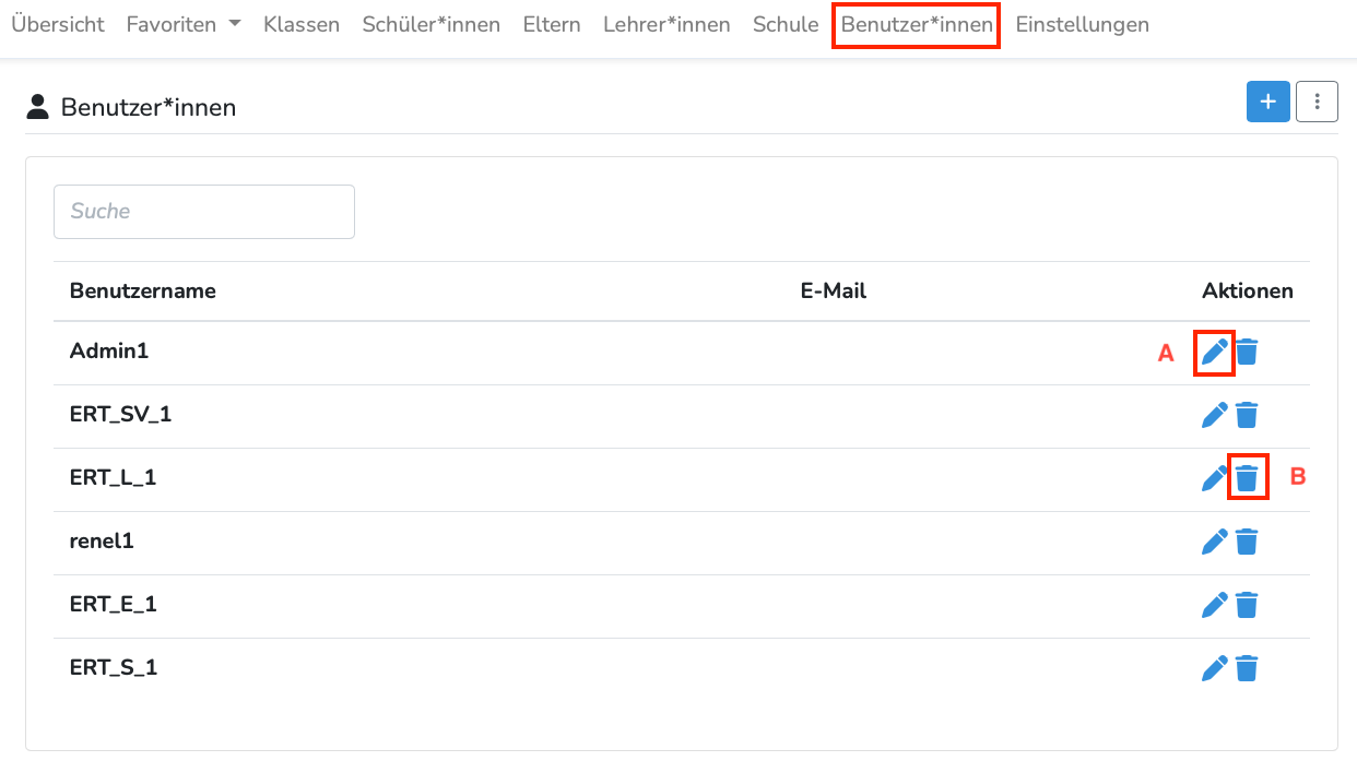 Nachdem sich die Nutzer*innen mit ihrem Zugangsschlüssel registriert haben, können Sie diese unter dem Punkt “Benutzer*innen” verwalten. Sie sehen eine Übersicht über alle Nutzer*innen und können mit einem Klick auf den Stift (A) ein Konto bearbeiten bzw. mit einem Klick auf den Papierkorb (B) ein Konto löschen. Im Suchfeld können Sie schnell nach bestimmten Konten suchen.