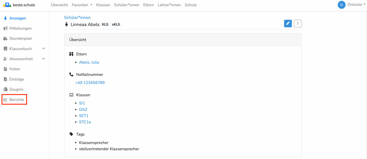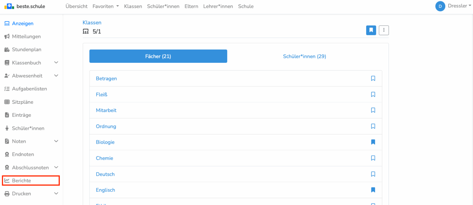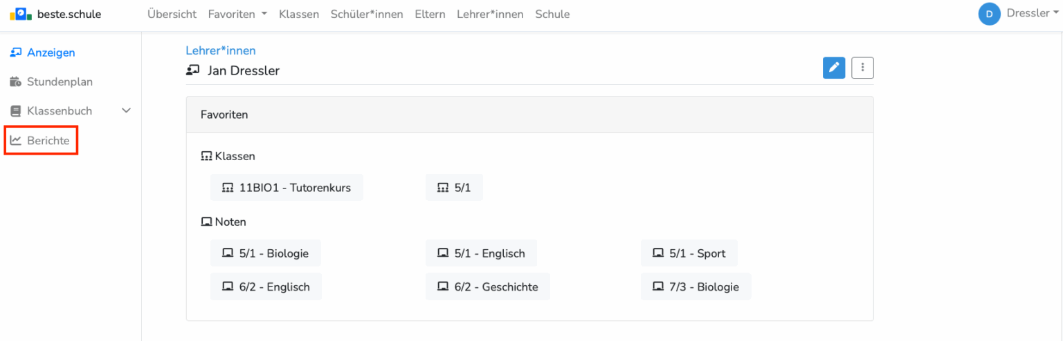 Sie finden den Reiter "Berichte" in der linken Navigationsleiste, sobald Sie eine Klasse, einen Schüler oder eine Lehrkraft (einschließlich Ihrer eigenen Person) ausgewählt haben: