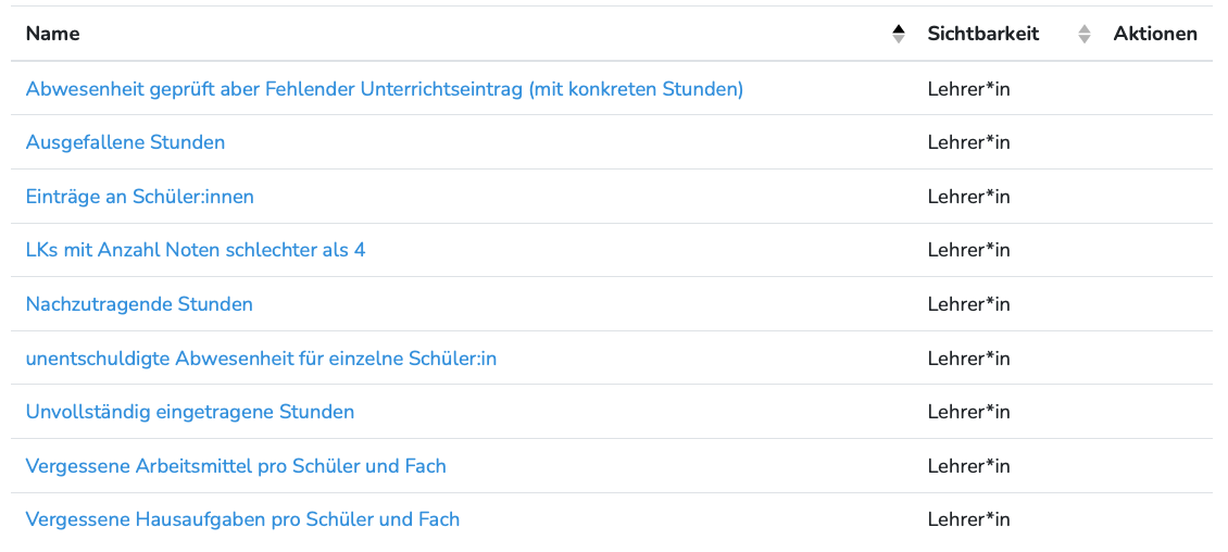 Ihre erstellten Berichte werden nun übersichtlich, wenn Sie als Lehrkraft im linken Übersichtsmenü auf Berichte gehen, aufgelistet. Sie können von hieraus nun jederzeit auf diese zurückgreifen bzw. individuell an Ihre Wünsche anpassen.
