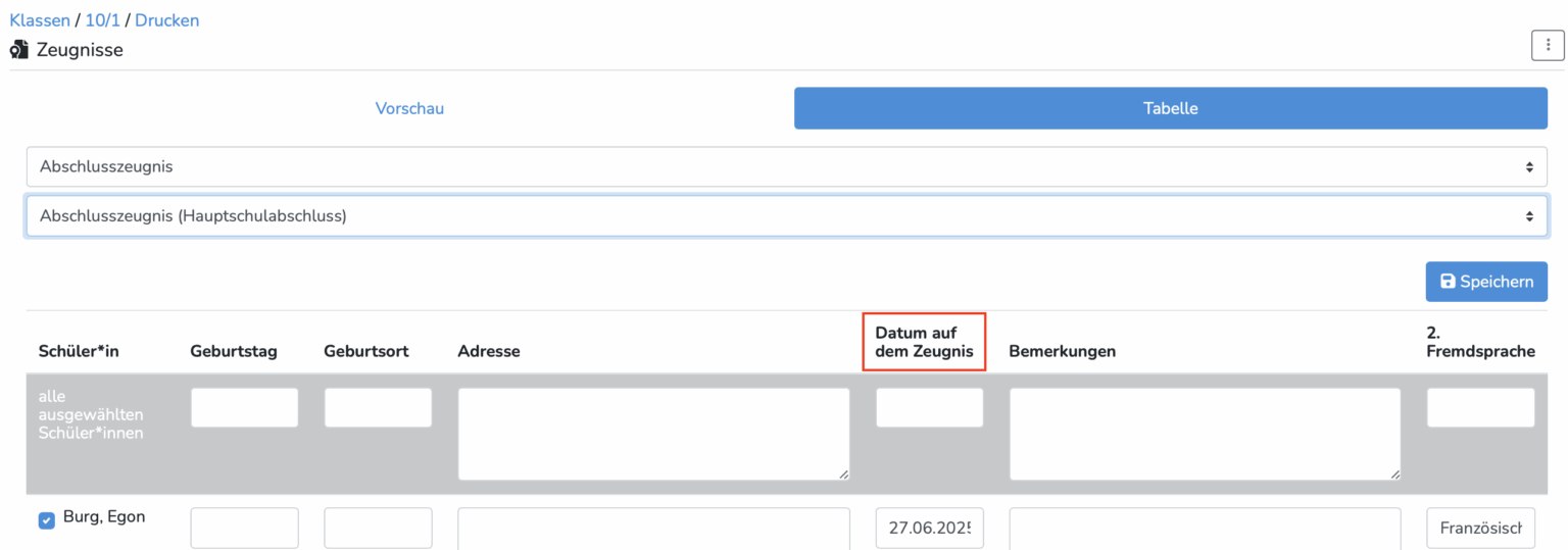 Um das Datum auf den Abschlusszeugnissen schnell anzupassen, klicken Sie oben links auf "Tabelle". Nutzen Sie anschließend die erste Zeile, um das Datum für alle Schüler*innen anzupassen. Klicken Sie abschließend auf "Speichern".