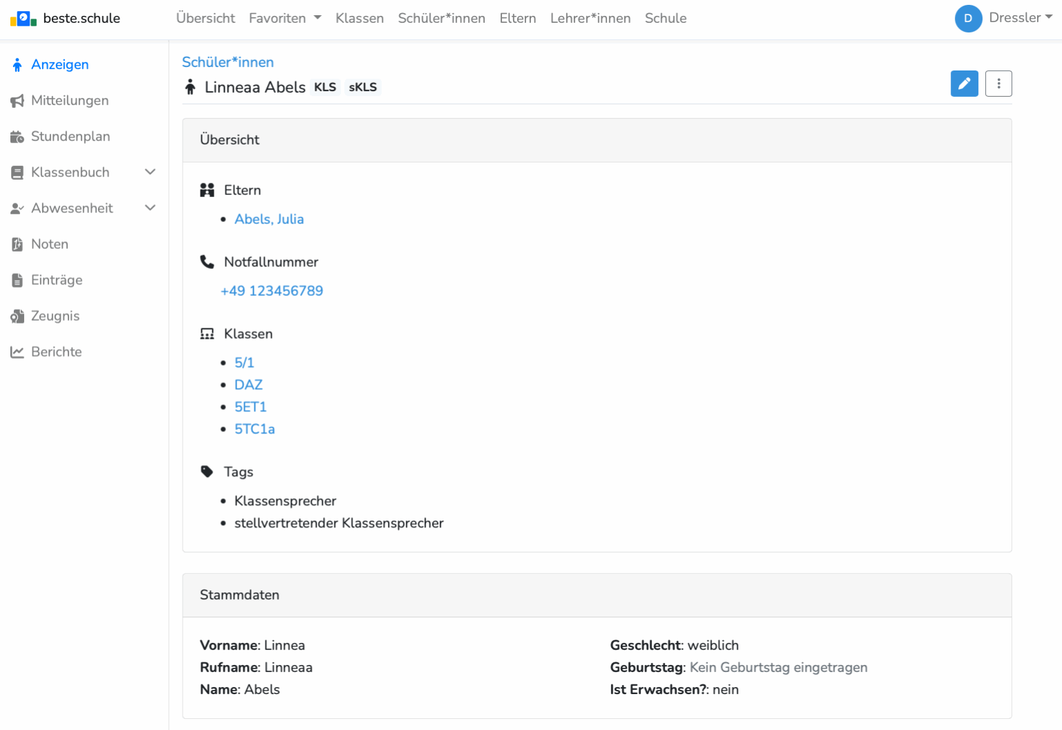Die Kontaktinformationen und Stammdaten von Schüler*innen können von Lehrkräften eingesehen, aber nicht bearbeitet werden – diese werden vom Admin gepflegt. Sofern Ihre Schule das Elternmodul nutzt, sind auch die Kontaktdaten der Eltern sichtbar. Sobald Sie die Seite einer Schülerin oder eines Schülers öffnen, werden Ihnen die verfügbaren Informationen angezeigt.