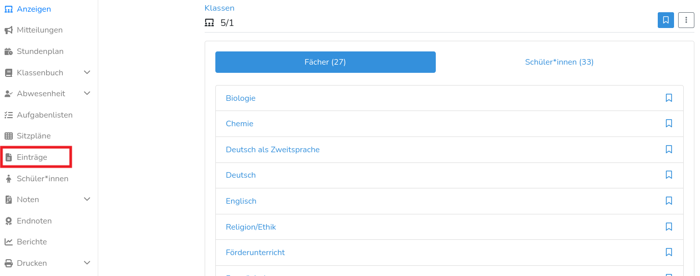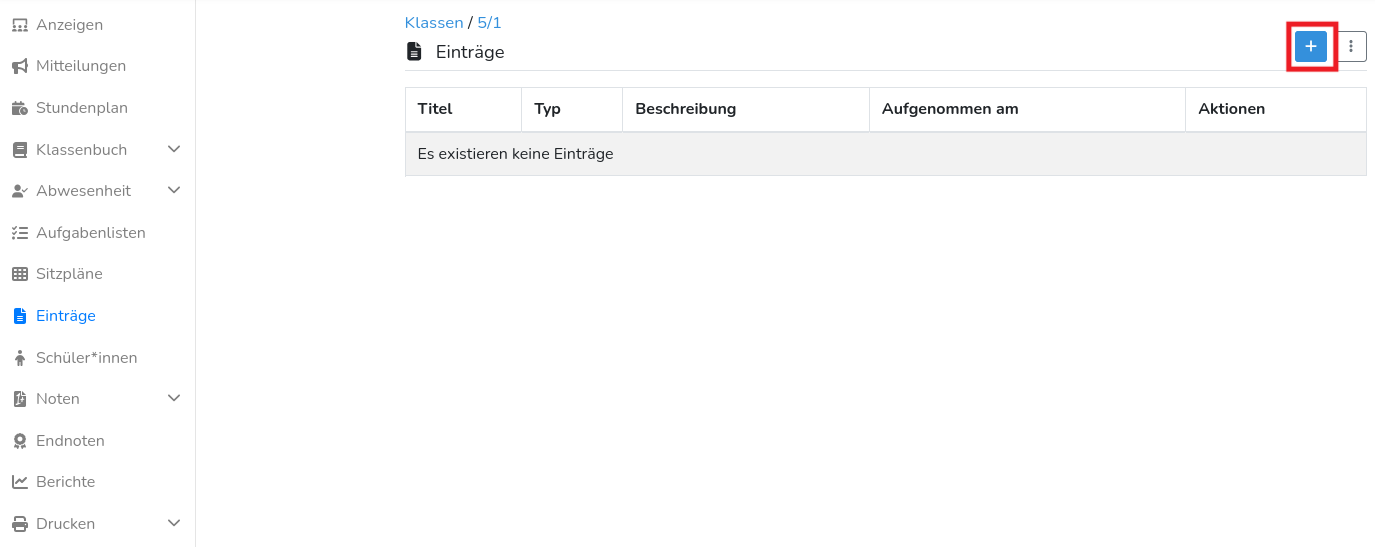 Sie können ebenso Einträge bei einer gesamten Klasse hinterlegen. Um Einträge zu hinterlegen, öffnen Sie eine Klasse und klicken anschließend links auf "Einträge".