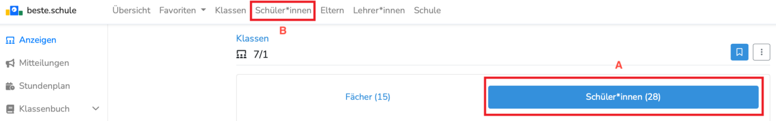 Die Seite einer Schülerin oder eines Schülers bietet Ihnen direkten Zugriff auf wichtige Informationen wie Noten, Kontaktdaten und bestehende Einträge. Zusätzlich können Sie hier auch neue Einträge hinterlegen – etwa zu Gesprächen, Vorfällen oder Absprachen. Der Zugriff erfolgt entweder über die Klassenzuordnung (A) oder die Gesamtliste aller Schüler*innen (B). So lassen sich alle relevanten Daten zentral einsehen und unkompliziert bearbeiten oder ergänzen.