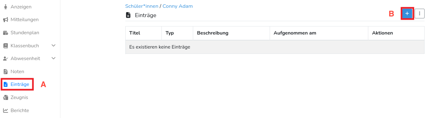 Nachdem Sie sich eine Schülerin oder einen Schüler geöffnet haben, klicken Sie links auf "Einträge" (A) und anschließend auf das "+" (B), um einen Eintrag hinzuzufügen: