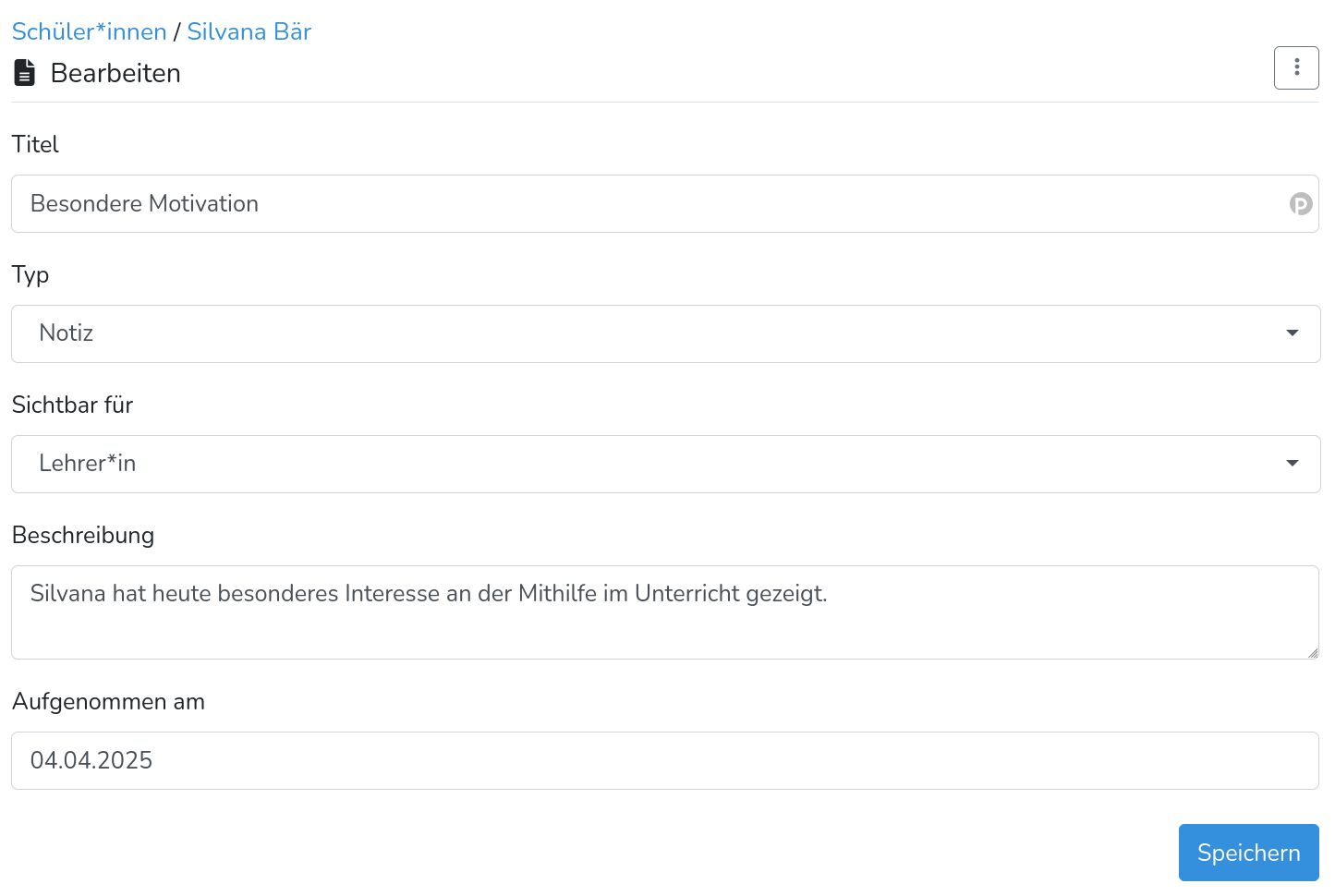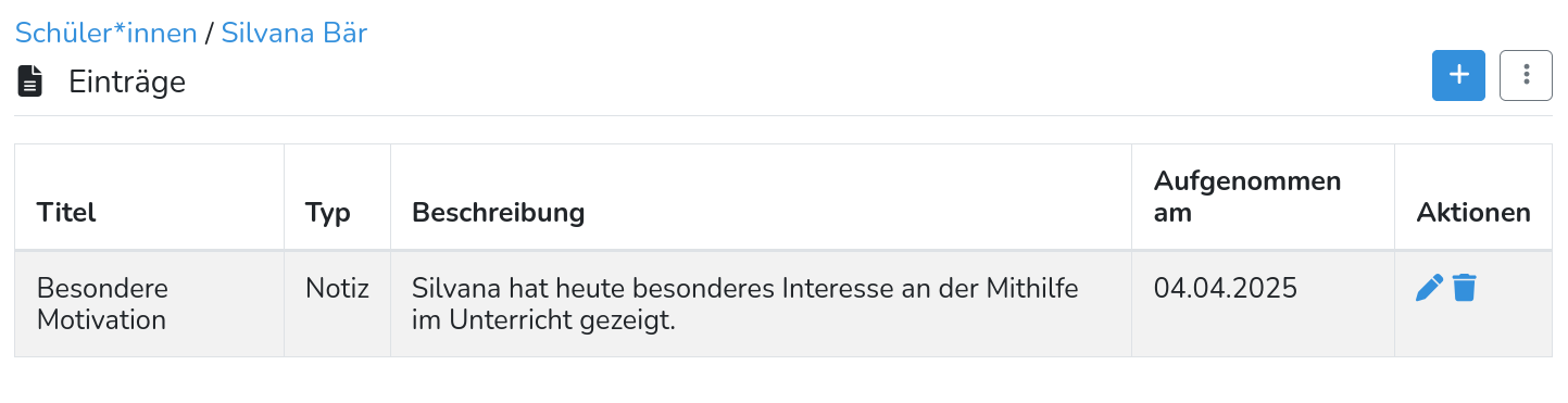 Als Lehrkraft können Sie bei Schüler*innen Einträge hinterlegen. Das ist praktisch, um etwa eine Entwicklung oder besondere Bedürfnisse zu dokumentieren. Die Typen für Einträge werden vorher durch Ihrem Admin hinterlegt (hier).