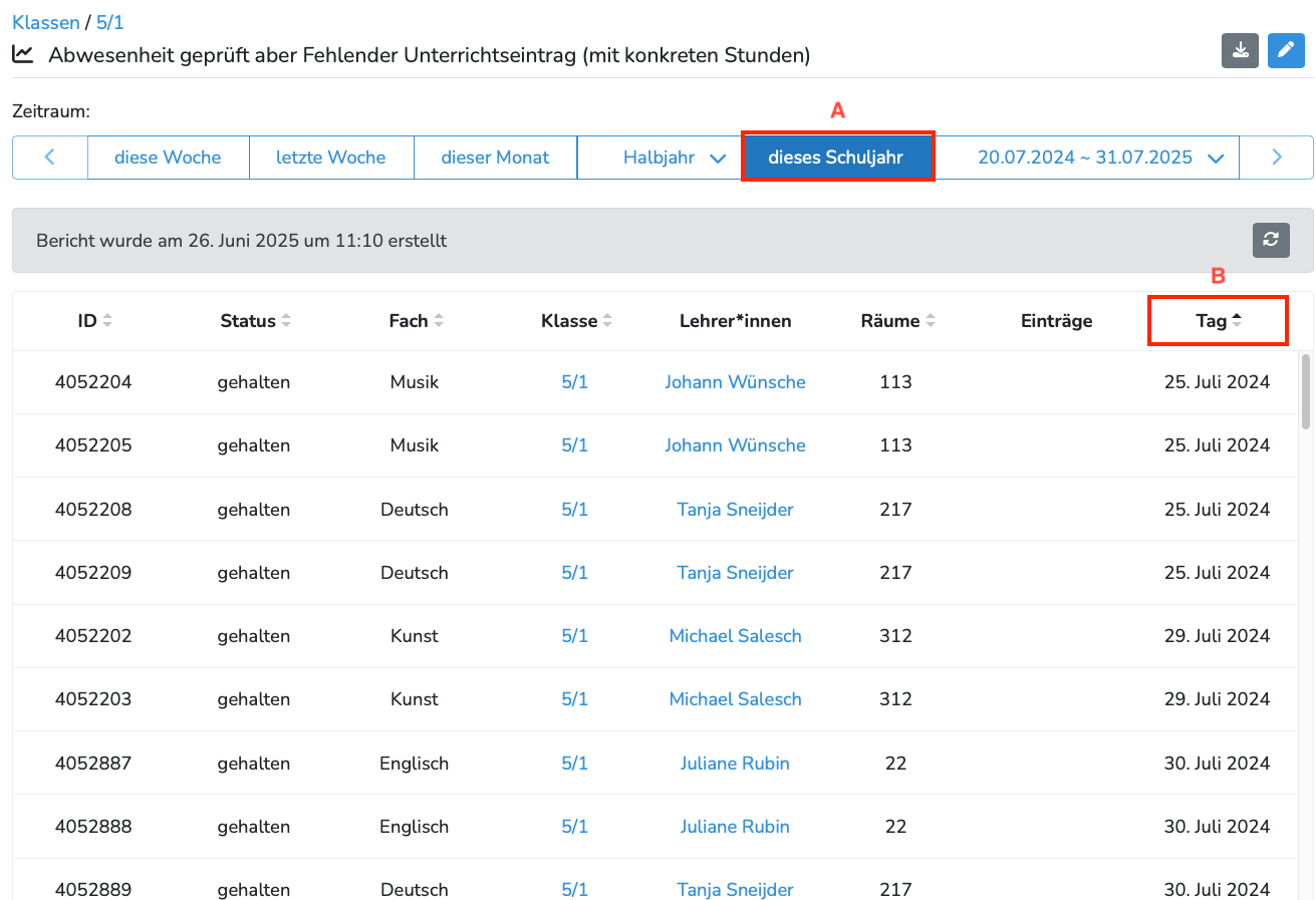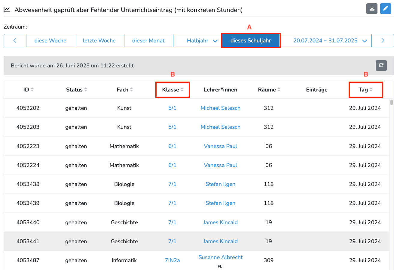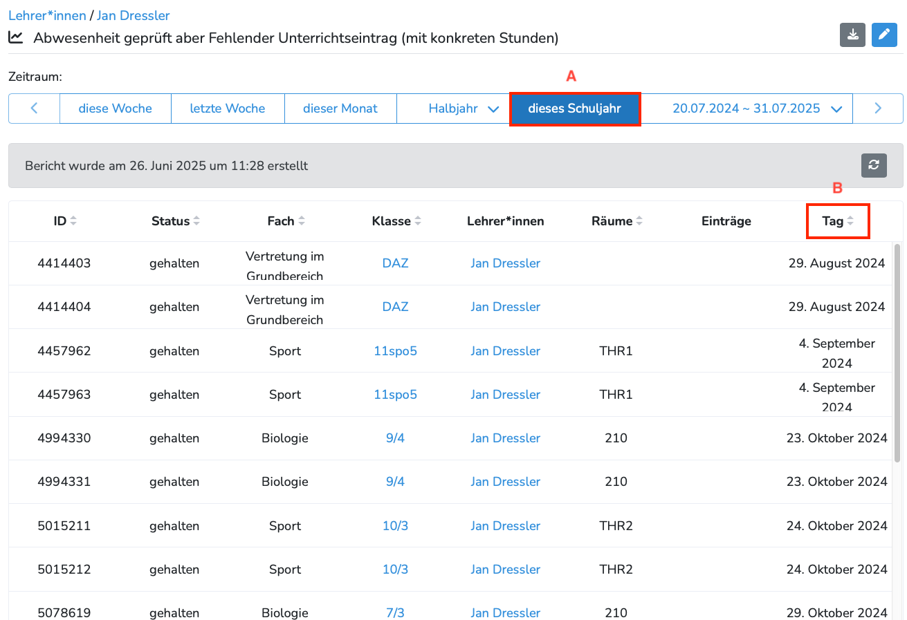 Anschließend wählen Sie den gewünschten Bericht aus. Nachdem Sie einen Bericht ausgewählt haben, können Sie den Zeitraum auswählen - z.B. für das ganze Schuljahr (A). Außerdem können Sie die Sortierung anpassen, um eine bessere Übersicht zu erhalten - z.B. nach Tag (B):