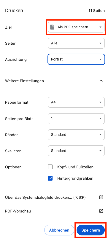Um die PDF herunterzuladen, wählen Sie dies entsprechend im Druckdialog aus und klicken Sie abschließend auf "Speichern":